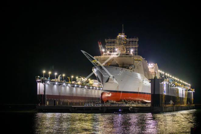 USS Harrisburg (LPD-30) sits on Ingalls Shipbuilding dry dock in October 2024.