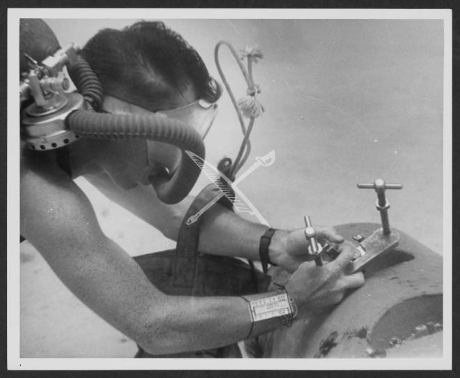 35 mm shots of men working underwater at Key West, Fla., Explosive Ordnance Team (EOD) man disarms influence mine for a training film.