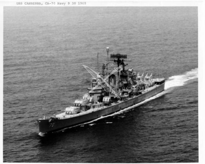 The U.S. Navy cruiser the USS Canberra (CA-70) at sea.