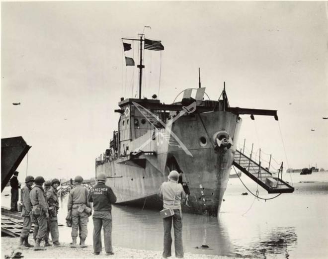 USCG photo, no date, shows a LCI with hole above waterline in bow, approaching a dock.