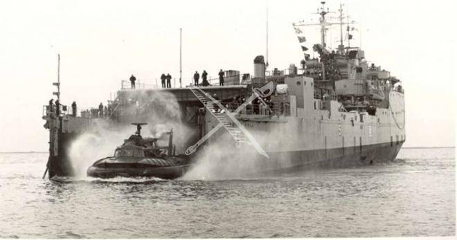 A PACV, patrol air cushion vehicle, demonstrates fly-away method used to leave the well deck of the dock landing ship, USS Gunston Hall, Jan 1967.