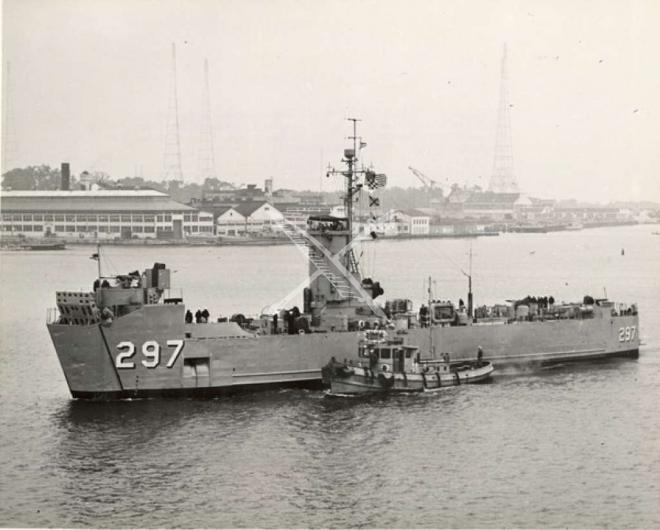 LSM-297 visits the US Naval Academy, Annapolis (photo dated October 10-12?, prob 1952); vessel approaches Santee Dock on Severn River.
