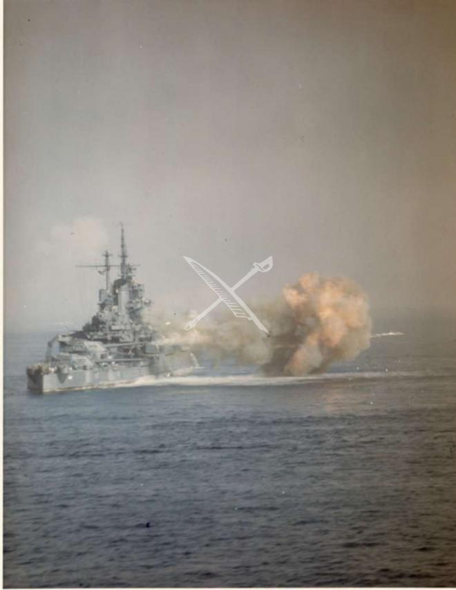 US Navy Battleship USS Idaho (BB-42) fires 14 /50 guns of turret three at nearly point-blank range, during the pre-invasion bombardment of Okinawa April 1, 1945.