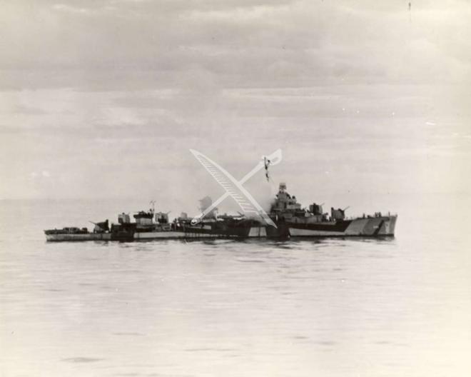 DD-585 Haraden, 13Dec1944, Sulu Sea, Philippine Islands; still smoking after being hit by a suicide aircraft.