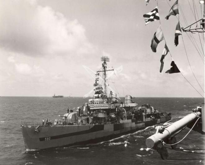 DD-590 Paul Hamilton, maneuvers alongside carrier Makin Island (CVE-95) 11Mar1945 during the Iwo Jima campaign. An unknown CVE is in the background