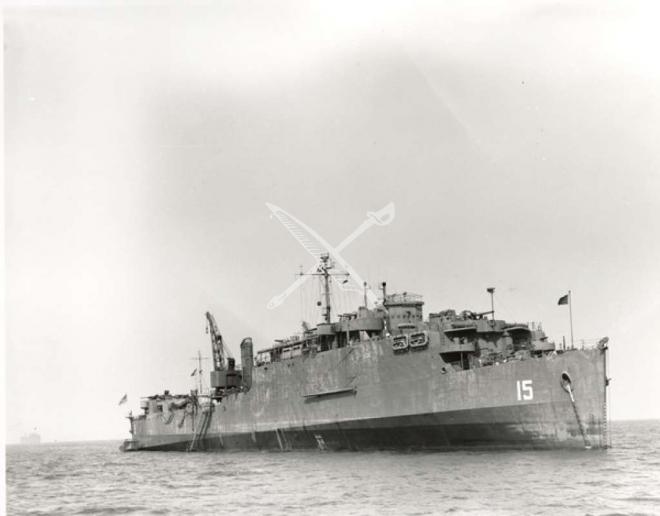U.S. Navy landing Ship Dock USS Shadwell (LSD-15) at anchor, 1950.