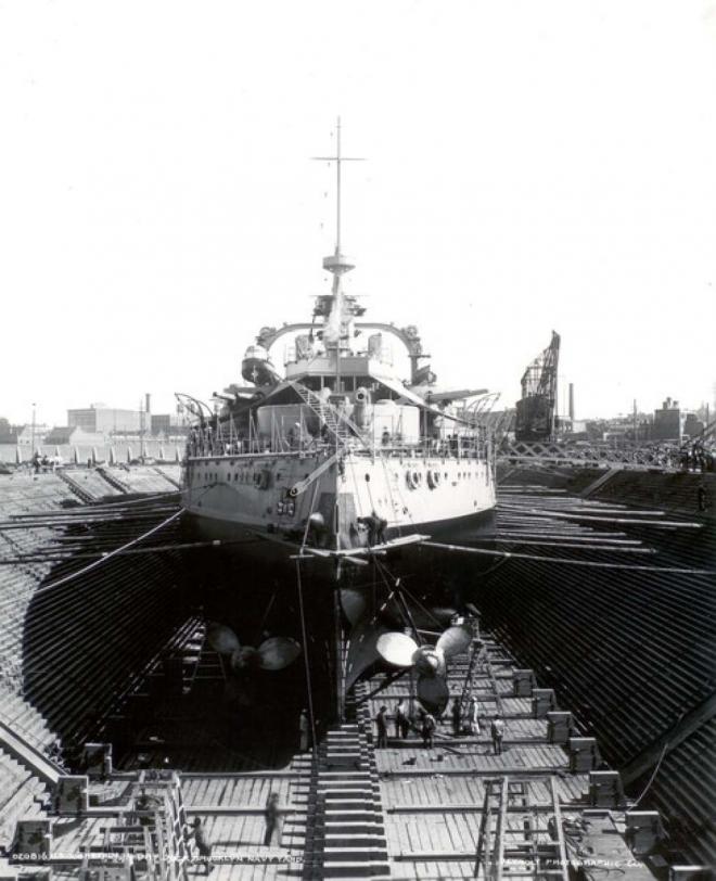 Photo of the battleship USS Oregon (BB-3) in drydock. Stern view taken in the Brooklyn Navy Yard. Photo taken circa 1900.