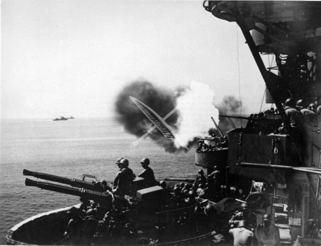 The USS Biloxi (CL-80) is shown firing her guns at the enemy somewhere in the Pacific during World War II. U.S. Navy photograph released April 6, 1945.