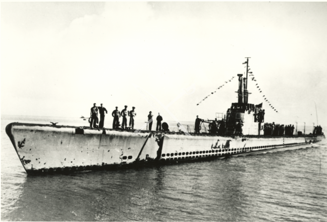 US Navy Submarine USS Trigger (SS-237) Returns to Midway Island after her ninth war patrol, in early 1944.