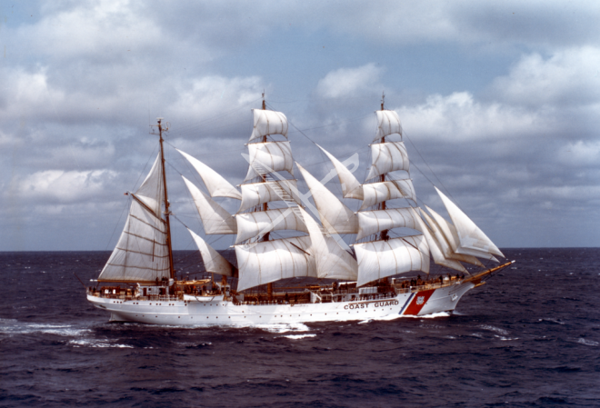 United States Coast Guard training vessel Eagle, with sails full. Coast Guard Day is August 4th, the day the Revenue Cutter Service, forbearer of todays Coast Guard, was established in 1790 by Congress under the guidance of Secretary of the Treasury Alex