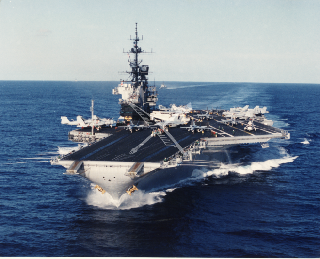 A port bow view of the aircraft carrier USS Midway (CV-41) underway on November 22, 1989. Photographer: PH2 Rodney C. Orallo