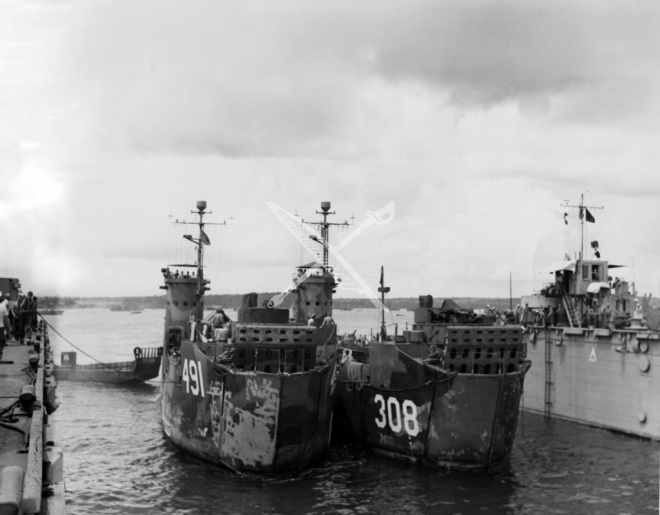 LSM-491 and LSM-308 are shown entering dock on September 10, 1945 in this photograph. From the James C. Fahey Collection at the U.S. Naval Institute.