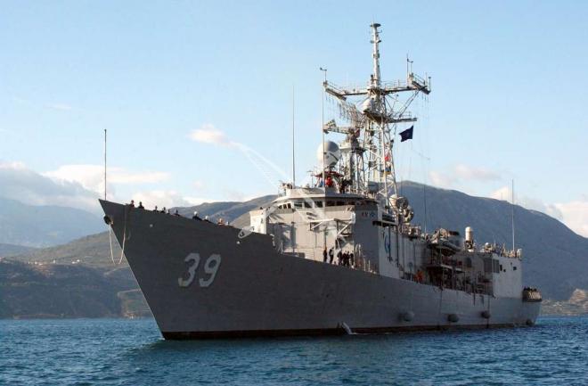 Souda Bay, Crete, Greece (Dec. 16, 2003) -- The guided missile frigate USS Doyle (FFG 39) is assisted by Greek tugs as she arrives for a brief port visit in Souda Bay, Crete, Greece. Doyle is part of NAT