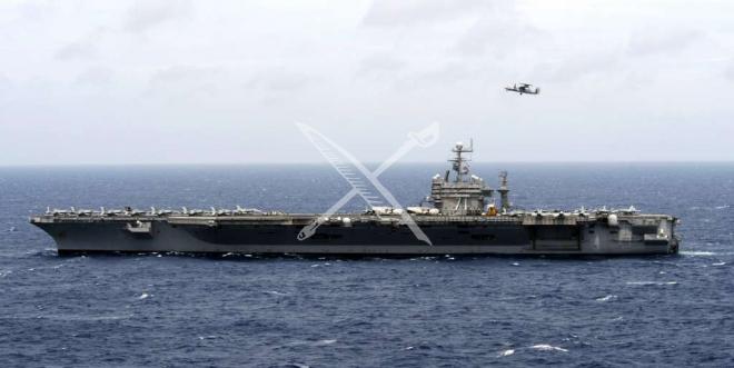 ATLANTIC OCEAN (July 21, 2008) A French E-2C Hawkeye assigned to the 4th Squadron flies over the aircraft carrier USS Theodore Roosevelt (CVN 71) during combined French and American carrier qualifications. This event marks the first