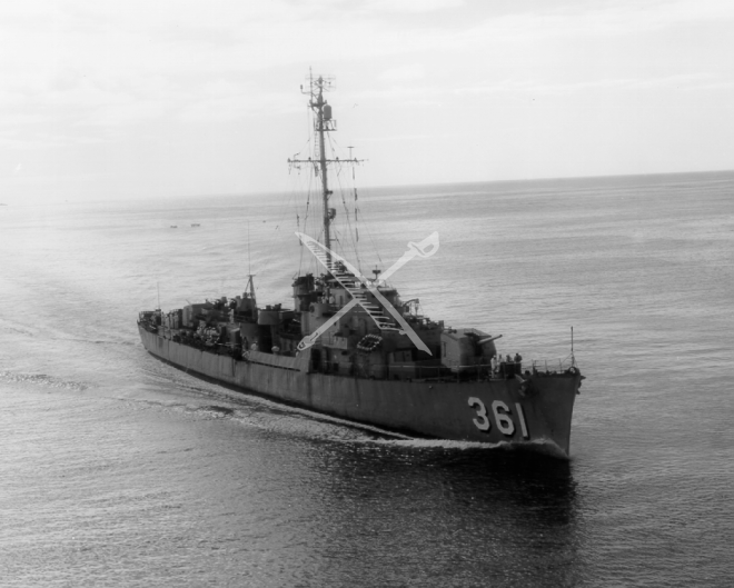 The U.S. Navy destroyer escort USS Walton (DE-361), 1954.