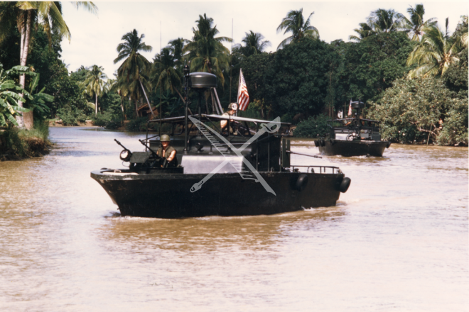 US Navy River Patrol Boat (PBR) Mark II patrols the Bassac River near Binh Thuy, June 1968