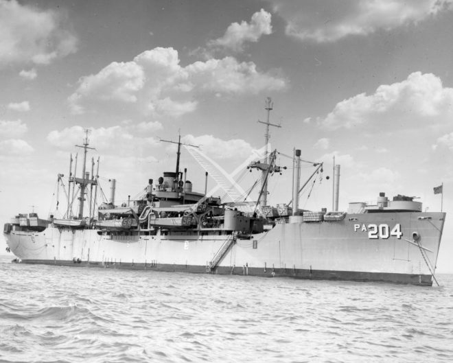 The U.S. Navy amphibious transport USS Sarasota (APA-204).
