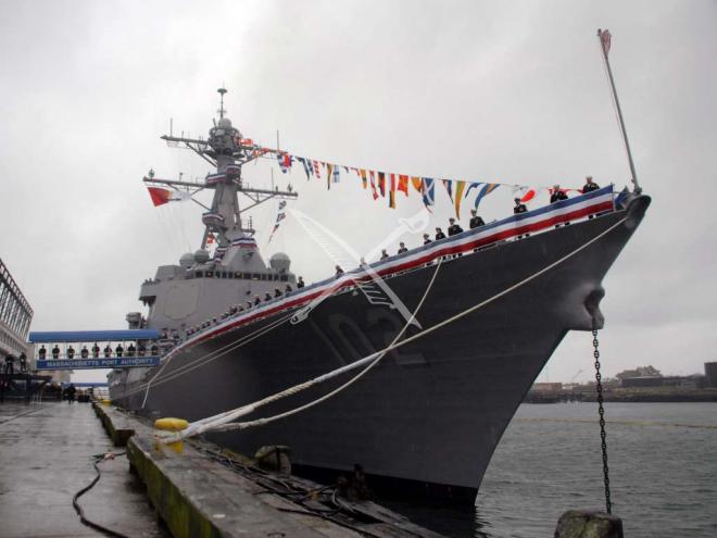 BOSTON (Nov. 3, 2007) - Sailors man the rails aboard guided-missile destroyer USS Sampson (DDG 102) during the shipÕs commissioning ceremony. Sampson is the fourth ship named for Rear Adm. William T. Sampson, a naval hero durin