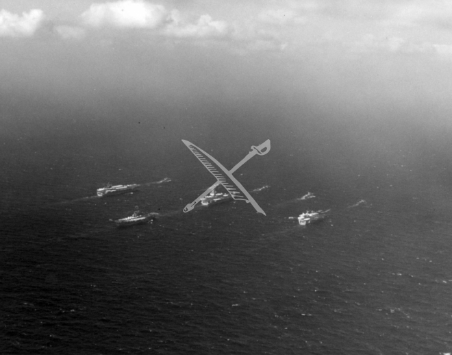 Cruising together in the South China Sea at the end of hostilities on January 28, 1973 are the USS Enterprise (CVAN-65), the USS America (CVA-66), the USS Ranger (CVA-61) and the USS Oriskany (CVA-34). The escort ships are the USS Bronstein (DE-1037), t