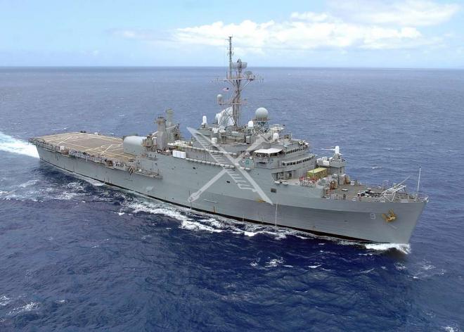 PACIFIC OCEAN (May 1, 2007) Ð Amphibious transport dock USS Denver (LPD 9) steams in formation during a photo exercise near Guam. Bonhomme Richard Expeditionary Strike Group consists of Amphibious Squadron 7, amphibious assault sh
