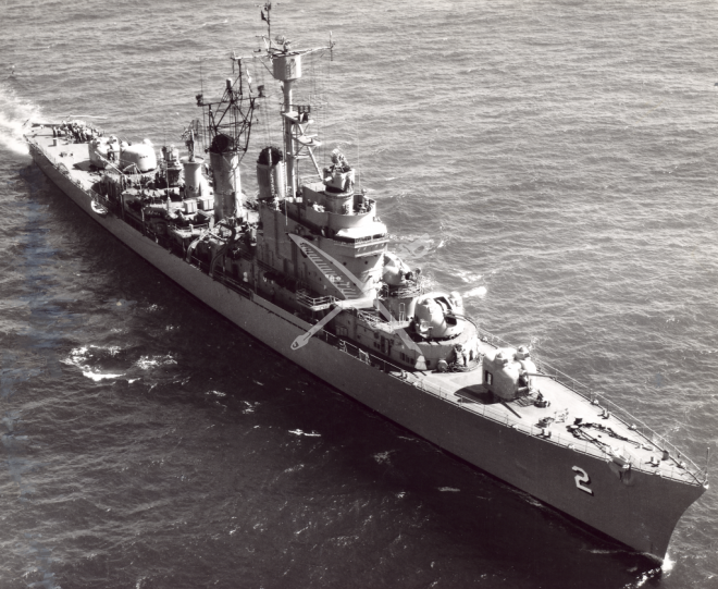 U.S. Navy Frigate USS Mitscher (DL-2) with HUL-1 on fantail