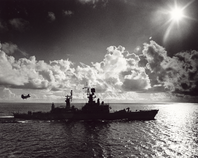 U.S. Navy Guided Missile Destroyer USS Fox (DLG-33) with a Sea Knight Helicopter from Helicopter Squadron Three (HC-3) loading supplies