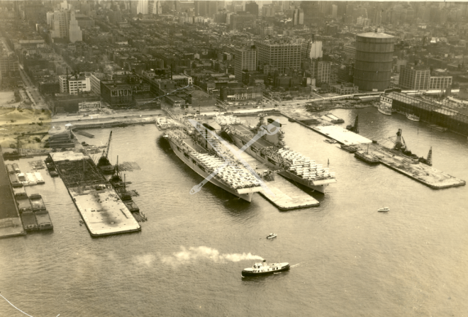 U.S. Navy Aircraft Carrier USS Lexington (CV-2) along side USS Saratoga (CV-3) on left of pier