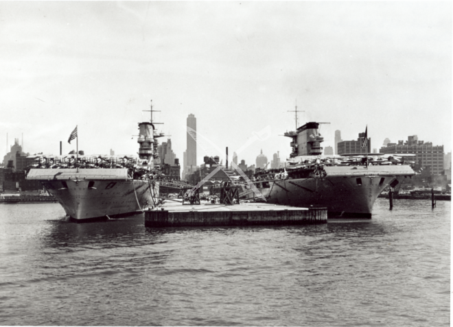 U.S. Navy Aircraft Carrier USS Saratoga (CV-3) with USS Lexington (CV-2) in background