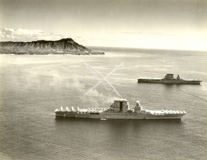 U.S. Navy Aircraft Carrier USS Saratoga (CV-3) with USS Lexington (CV-2) at anchor off Honolulu