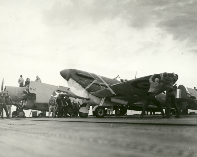 U.S. Navy Aircraft Carrier USS Wasp (CV-7) with a Spitfire ready to launch. The breaks were not strong enough to hold the plane in place while its engines were turning up