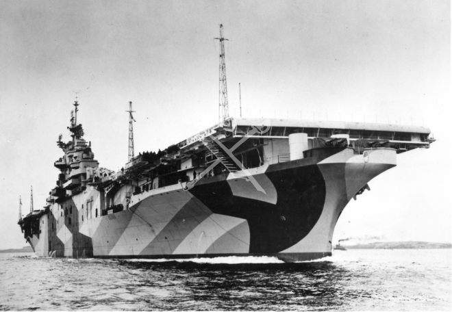 The USS Hancock (CVA-19) underway for the first time from the builders yard heads for South Boston for commissioning on April 15, 1944.