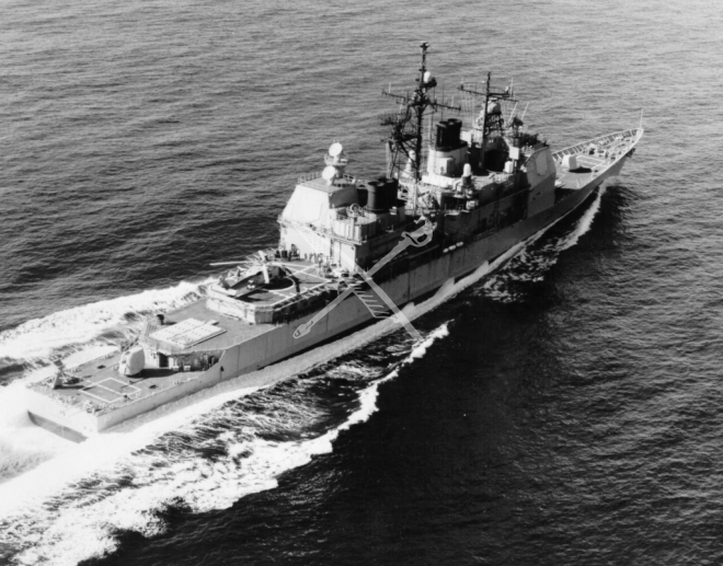 The U.S. Navy cruiser USS Cowpens (CG-63) taken 16 October 1990 underway off the coast of New England.