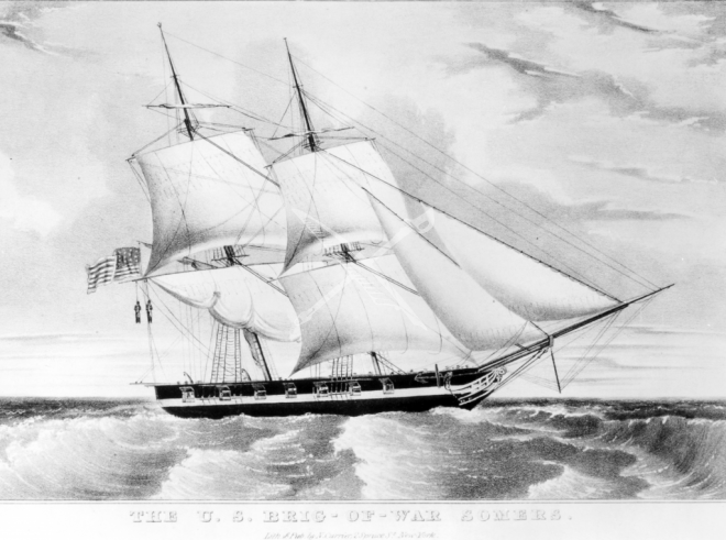 From the Currier and Ives lithograph titled "The U.S. Brig-of-War Somers", published in 1843. The notorius brig sank in the Mexican-American War in 1846. Incidents aboard this naval training vessel inspired Herman Melville's novel Billy B
