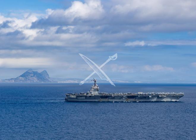USS Gerald R. Ford (CVN-78) transits the Strait of Gibraltar in October 2025.