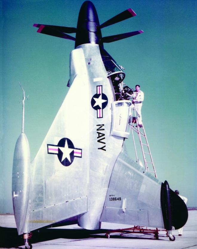 The sole completed Convair XFY-1, BuNo 138649, rests in its normal takeoff and landing attitude on its castering landing gear at Naval Auxiliary Air Station Brown Field, California, on 26 October 1954.