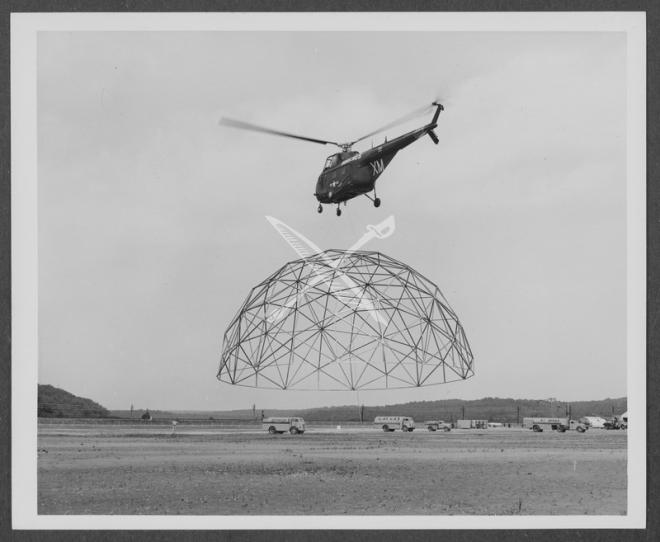A Marine HRS Chickasaw helicopter flies away with its own hangar during a demonstration at Quantico, Virginia, 3 August 1954.