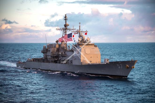 Ticonderoga-class guided-missile cruiser USS Lake Champlain (CG 57) transits the Pacific Ocean, Feb. 9, 2022.